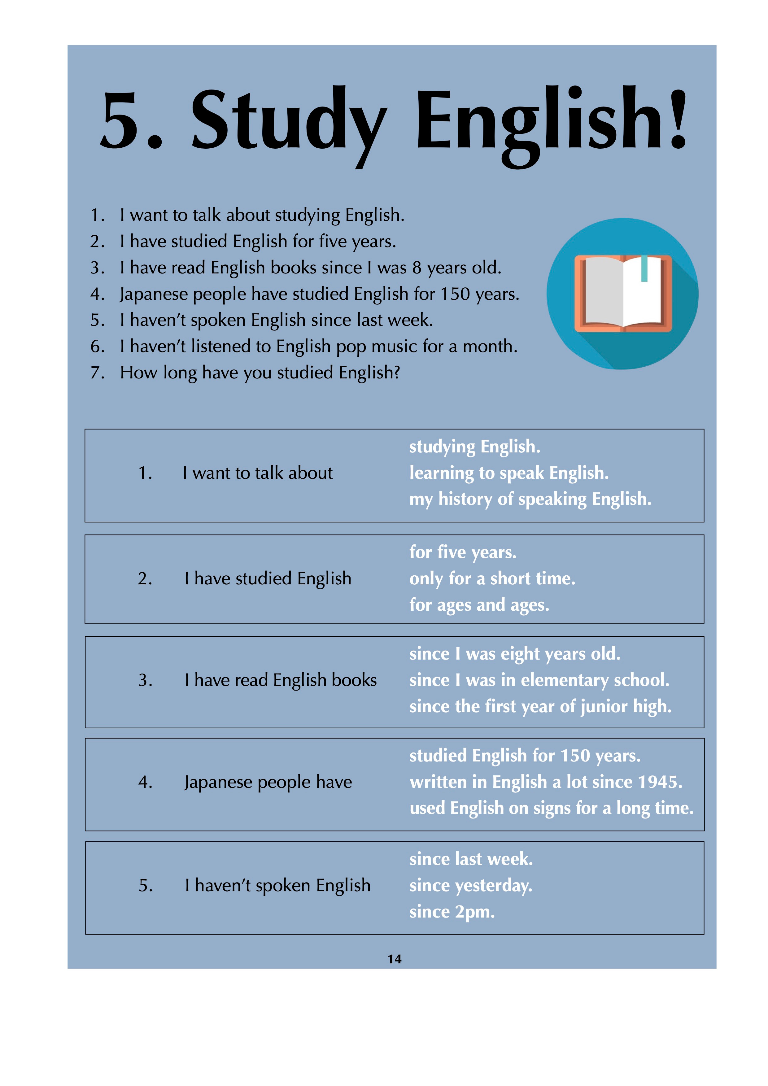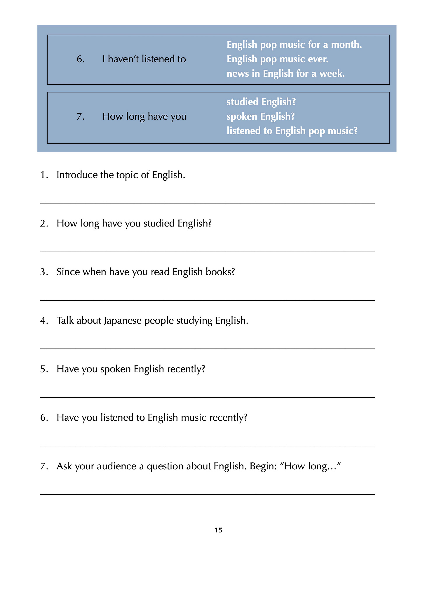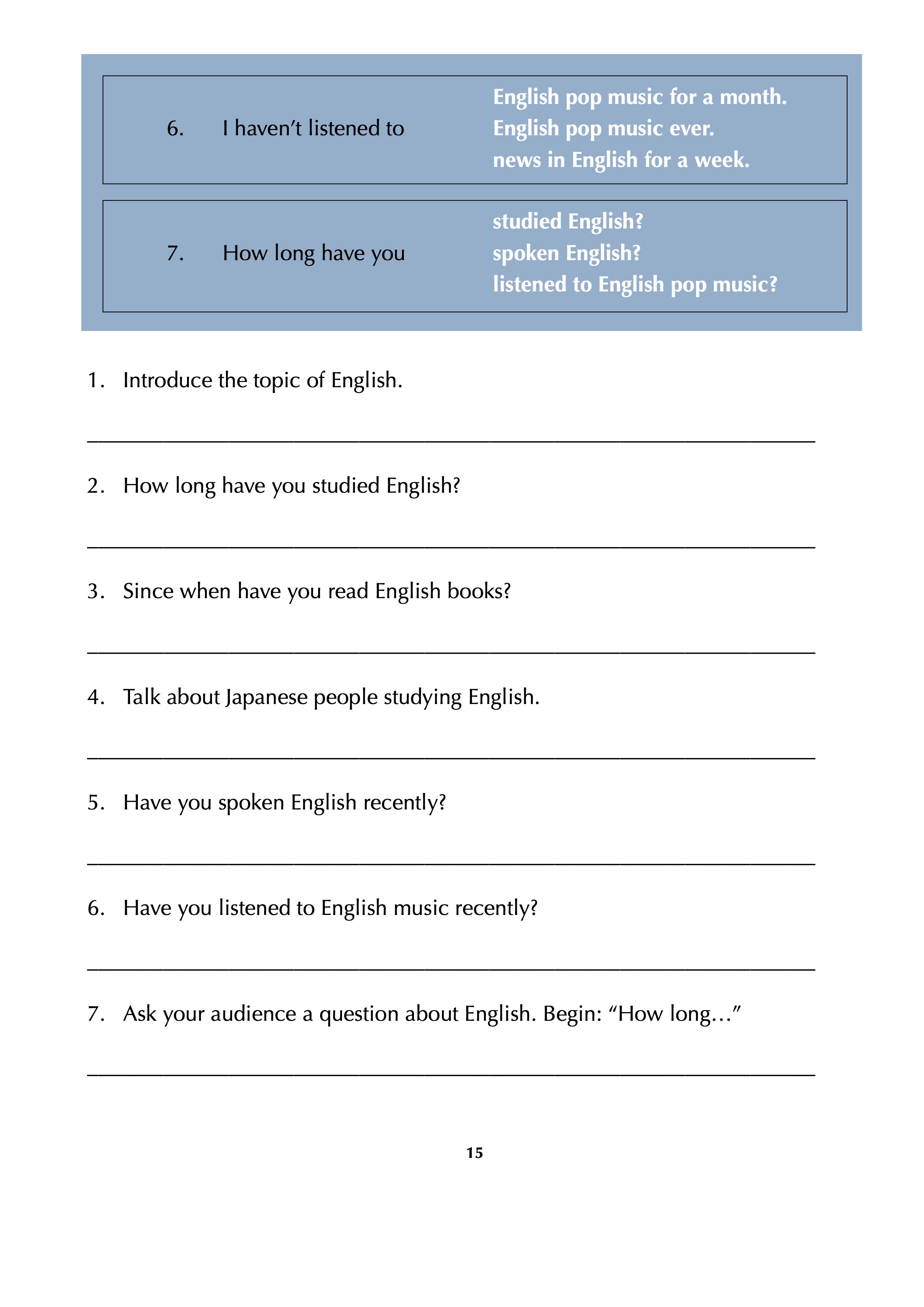 If necessary pre-teach the grammar forms since + specific moment in the past (I’ve spoken English since I was 10 years old) and for + length of time (I’ve spoken English for five years).